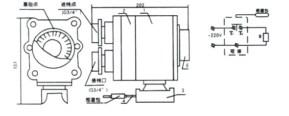 溫度器主要由芯盒1.接線盒;2.盒座;3.控溫元件和測溫毛細管;4.溫度調(diào)節(jié)盒;5.膠封材料等組成。芯盒里裝有控溫元件??販卦{(diào)節(jié)軸和測溫毛細管采用隔爆結(jié)構(gòu)和膠封結(jié)構(gòu),供控制電纜的進線和出線使用。產(chǎn)品結(jié)構(gòu)見下圖: