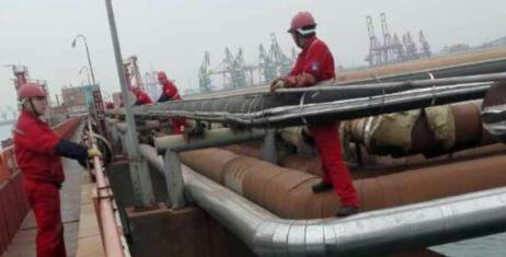 上圖為安裝工人為海上石油運(yùn)輸管道敷設(shè)伴熱帶