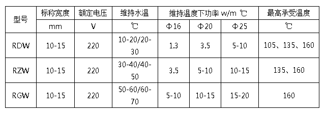熱水伴熱用自限溫電伴熱帶規(guī)格型號一覽表